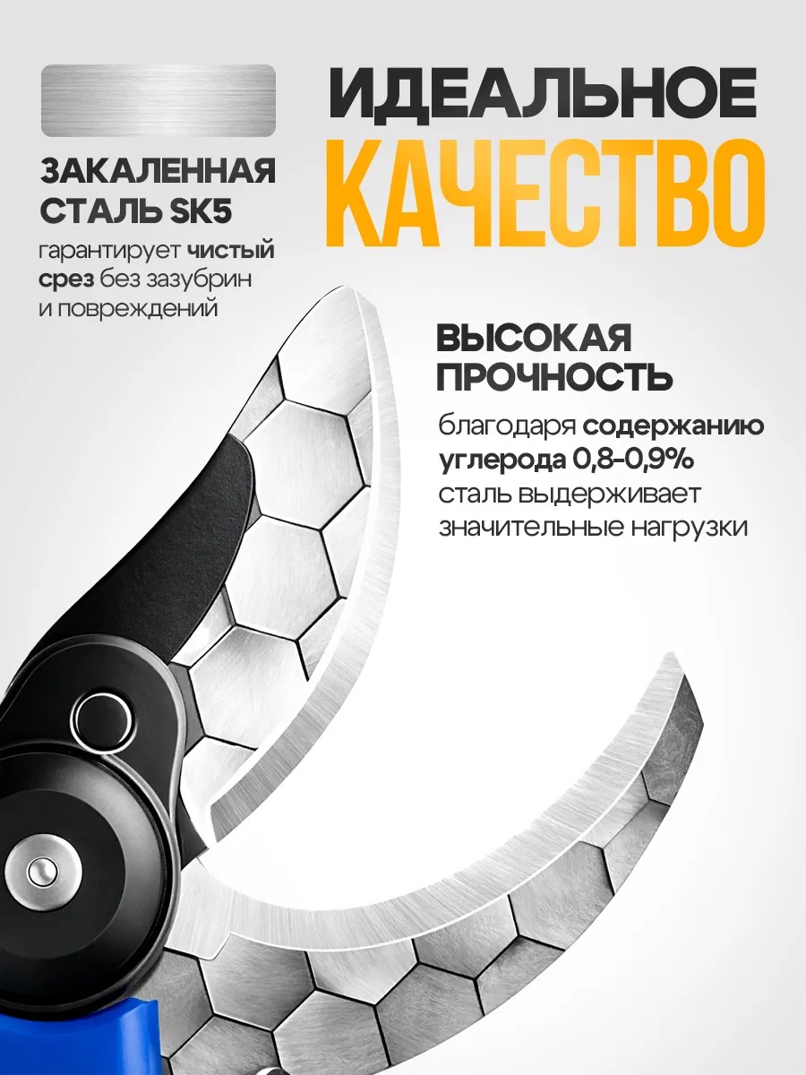 Высокое содержание углерода повышает прочность и устойчивость к нагрузкам, позволяя секатору сохранять остроту даже при интенсивной обрезке.